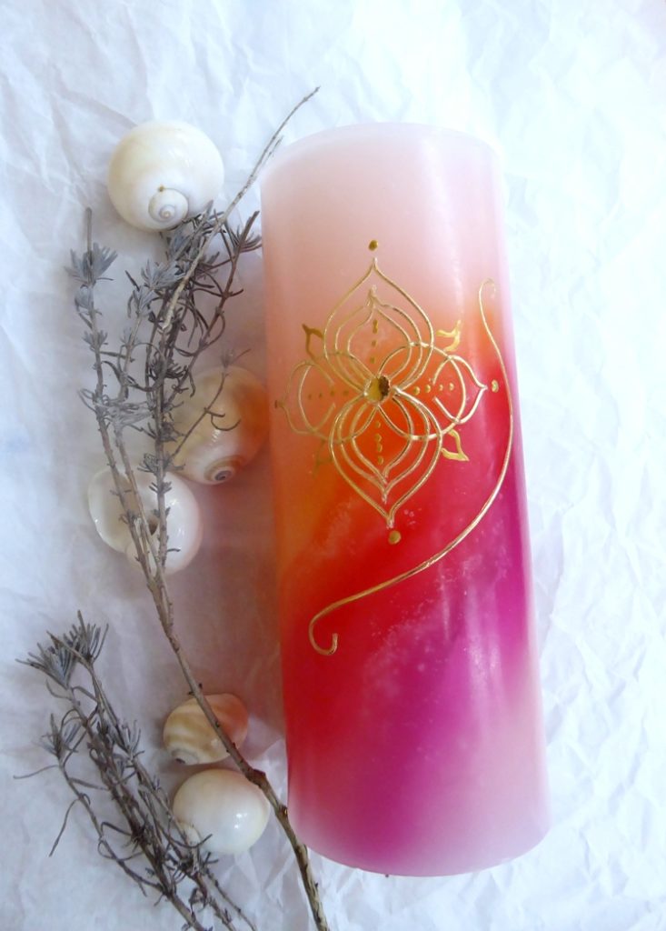 - Von Hand gegossene Kerze in Aquarell Wachs mit Mandala verziert. 17,5cm hoch 28,90 Euro