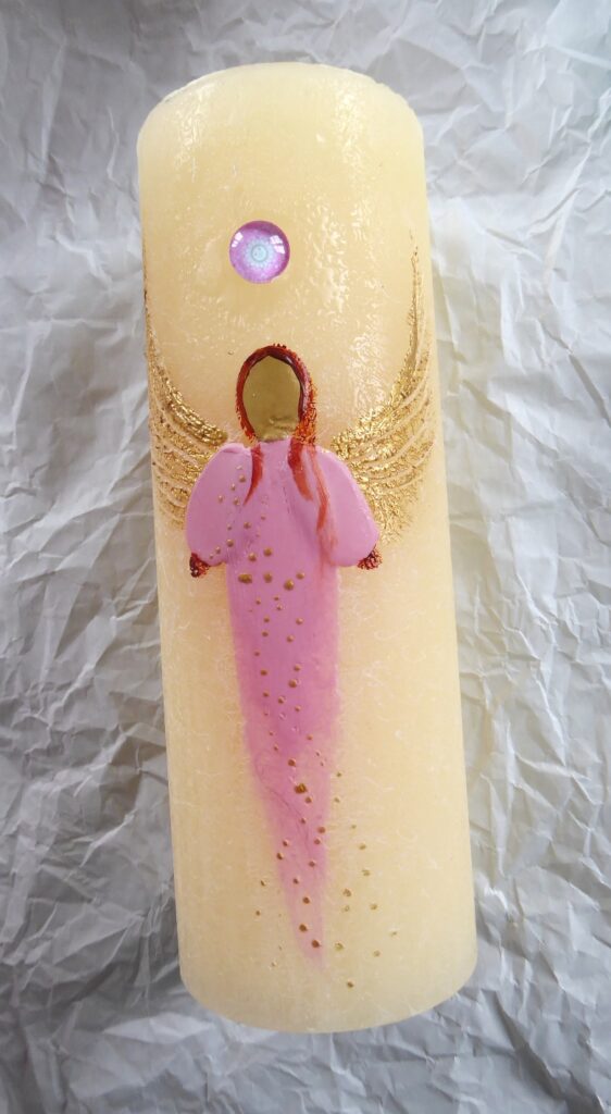 - Titel „Engelkerze“ Größe: 25cm hoch, 7cm breit Preis: 45,- Euro